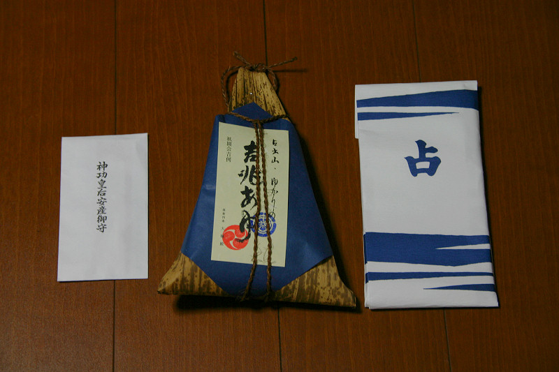 『 「鮎釣山」ともいう。神功皇后が肥前国松浦川で鮎を釣って戦勝の兆としたという説話による。御神体(人形)は金の烏帽子に太刀をはき,右手に釣竿,左手に釣り上げた鮎を持って立つ。神功皇后は古くから安産の神として祀られ,山鉾巡行のくじ順が早いとその年は御産が軽いといわれる。安産の神として公家の信仰も厚く女院や公卿の姫君などから寄進された小袖や打掛,水干などが多数御神体衣装として保存されている。水引は三十六歌仙図の刺繍,前掛,胴掛は日本三景の綴錦で天保二年(一八三一)の製作で,奥川米厳の松島図下絵は別に保存されている。見送には花鳥竜文の綴錦が用いられ,宵山には安産の御守りと腹帯とが授与される。 』 『占出山の駒札より』 友釣り