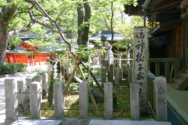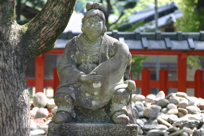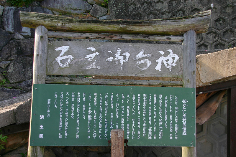 釣竿を埋めたところ竹が生えたという「神功皇后釣竿竹」が「須磨寺」(兵庫県)に,「神功皇后釣竿の竹」が「生田神社」(兵庫県)に,また「玉島神社」(佐賀県)にもあります。 しかし,『東松浦郡史』や『唐津松浦潟』では違った表現となっています。 玉島川の鮎に限り唇金色と言っている様です。 『東松浦郡史』には下記の様にあります。 「金の素針を入れ給ひ鮎を釣り給ふに,忽ちかゝれり,此の素針にて釣り給ひしことは神秘なりとかや,釣竿は攝州播州の堺なる幹竹といふ竹なり,今に生田須磨邊に釣竿竹とてあり,此の金の素鈎にかゝりし因縁にて此の玉島川の鮎にかぎり唇金色なりと謂ひ傳ふ。其の節皇后の上り給ひし石を,紫臺石といふ,今は川底に埋みて見えず,川岸の上に玉島山といふ所あり,則ち皇后の宮を安置し奉り聖母大明神と称し奉るなり。また干珠満珠の山とて二あり,此の山の隣るところに加茂某といふ隠者あり,常に語りていふ,我住所の前に細き土橋あり,溝川なり,前は往還なり,適々大地震と外々騒ぐことあるとき,此の玉島山には地震を知らず,故に此の家に生れたるもの地震を知らずと,其の天理如何と笑談せり,これも御神徳なるべし。」 『唐津松浦潟』では下記の様にあります。 「當時釣竿に用ひ給ひし竹は此の丘上に取りしものにて,今猶其の竹種杜 域内に一叢となつて残ってゐる。又摂州播州の境にある韓竹といへるものも其種顛で,生田,須磨の地方にては釣竿竹として用ひられ てゐるといふ。此の川の鮎の唇金色なるは,金の針を鉤げて鉤となし釣り給ひしによるとか,仲々理屈をつけたものである。 皇后の立ち給ひし石を紫臺石といふ。今は河底に没して見江ず。」