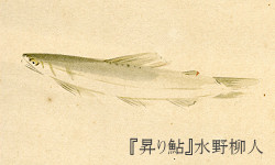 それによると, 他には,静岡の大井川辺りでは蠅を喜んで食べるということで, 愛媛の大津では細い縄で鮎を引っ掛けて釣るという,これは今のゴロ引きのことなのでしょうか? 少なくとも元禄の頃には現代の釣りに近いやり方で獲っていたことが想像できます。 1832年頃,夏から秋まで友釣という新しい釣漁で運上に影響が出てたが,簗漁をやっている村々からの訴えで釣漁差留して頂いたことによる礼状『頼書一札之事』*4や1854年頃には,安部川で最近,鮎友釣という鮎漁が流行し農業をせず釣りや見物して,農業の妨げとなっているので鮎友釣の差留の要望書『乍恐以書付奉願上候』*5など各地の古文書に「友釣」という文字が見られます。 『加藤寛斎随筆』(1782~1866年)には,「鮎のをとり釣 川々にて鮎を釣に,をとり釣と云事を工風して,生たる鮎を一ツ,鼻を釣針をさして,針の側に是を溺かせ,針ハ四ツ五ツをたれて水中ニ設入て,棹を持て魚の懸るをまち,魚友を慕ひ,群来りて針に摺りて遊ぶ時針貫る也 針ハ木綿針,或ハ指針を曲て手ニ付ル,至てよく釣ると云,」と仕掛けについて詳しく書かれています。 本屋で偶然見つけた 「垢石翁は私の釣りの先生である。もう十何年前に,私は富士川の 簗漁・鵜飼 「古事記」「日本書紀」には 「故隨其敎覺,從其八咫烏之後幸行者,吉野河尻時,作筌有取魚人。爾天神御子,問汝者誰也,答曰僕者國神,名謂贄持之子。此者阿陀之鵜養之祖。」 『古事記』より 「天皇問之曰,汝何人。對曰,臣是磐排別之子。排別,此云飫時和句。此則吉野國樔部始祖也。及縁水西行,亦有作梁取魚者。梁,此云揶奈。天皇問之。對曰,臣是苞苴擔之子。苞苴擔,此云珥倍毛菟。此則阿太養鸕部始祖也。」 『日本書紀』より 他に『日本書紀卷第廿七』の *1 * 『箋注倭名類聚抄』巻第八 龍魚部 龍魚類 崔禹食經云,貌似鱒而小,有白皮,無鱗,春生夏長秋衰冬死,故名年魚也, *2 * 『古事記』 亦到坐筑紫末羅縣之玉嶋里而,御食其河邊之時,當四月之上旬。爾坐其河中之礒,拔取御裳之糸,以飯粒爲餌,釣其河之年魚。 其河名謂小河,亦其礒名謂勝門比賣也。 故,四月上旬之時,女人拔裳糸,以粒爲餌,釣年魚,至于今不絶也。 *3 * 『日本書紀』卷第九 夏四月壬寅朔甲辰北到火前國松浦縣而進食於玉嶋里小河之側於是皇后勾針爲鈎取粒爲餌抽取裳系爲緡登河中石上而投鈎祈之曰朕西欲求財國若有成事者河魚飮鈎因以舉竿乃獲細鱗魚時皇后曰希見物也 希見此云梅豆邏志 故時人号其處曰梅豆羅國今謂松浦訛焉是以其國女人毎當四月上旬以投鈎河中捕年魚於今不絶唯男夫雖鈎以不能獲魚 *4 『頼書一札之事』 (宮芝古文書同好会解読より全文引用) 一田方松野大見簗附村々より 御頼申上候ハ,天野村川筋 於堰所,二月上旬より三月迄 少鮎釣漁仕,引続夏より秋迄 友釣と唱候新規之釣漁仕, 中々夥敷儀ニ而,簗附村々 既ニ御運上ニも相拘り候義ニ付, 其御村方相願,前書釣漁 御差留之義,韮山 御役所江 御願立,則御触流頂戴仕, 早速御差留ニ相成候段 一統難有仕合奉存候,然上者 右一条ニ付,如何様成義到来 致候共,諸入用者勿論何事 成共、其御村方案内次第、差 支無之様村々一同急度 取計可申候,為後日連印 一札差出申候,仍而如件 天保三辰五月日 大仁村 熊坂村 小立野村 日向村 加殿村 上白岩村 関野村 梅本村 月ケ瀬村 武右衛門殿 源蔵殿 村々役人衆中 *5 『乍恐以書付奉願上候』 (宮芝古文書同好会解読より全文引用) 安倍山中外三拾五ヶ村役人惣代門屋村名主惣左衛門外五人 奉申上候,私共村々之儀者安倍川附之村方ニ御座候処,近来鮎友釣 と唱,鮎漁流行いたし,農業ニ罷出候者共見物等いたし,日々農 業之妨ニ相成候間, 池田岩之丞様御支配右友釣差留之段 奉願上候処,早速御聞済被成下御触流し被下置候ニ付,其節より暫之間差 留り候処,又々追々流行いたし,当時ニ而者村々若者共者勿論,其外 心得違之者共農業打捨,友釣而已渡世同様ニいたし候者共 有之,何れ厳敷差留候而も村々多人数之義ニ付,行届キ 不申候之間,無拠奉願上候,何卒格別之御慈悲を以, 右鮎友釣御差留御触流し被下置候様奉願上候,依之此趣 乍恐以書付奉願上候,以上 嘉永七寅年七月 安倍山中三拾六ヶ村 惣代 門屋村名主 惣左衛門 松の村名主 五郎左衛門 油島村名主 佐左衛門 蕨野村名主 与作 横山村名主 源兵衛ヵ 桂山村組頭 角左衛門 紺屋町御役所 関連ページ: 外部リンク: 参考文献: