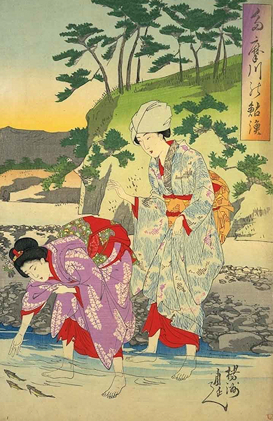 三枚続きの錦絵。楊洲周延が多摩川の鮎漁の様子を描いたものとされる。