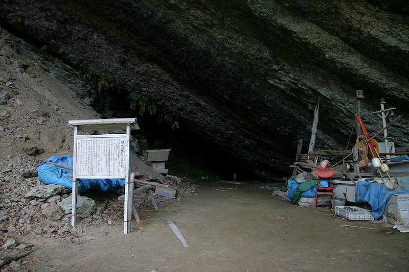 凝灰岩の絶崖にできたこの洞窟は,東に向かって開口しており,幅三○m,奥行き三○mあります。