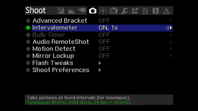 - インターバル撮影をしないときは,8. または9. の Intervalometer,Bulb Timer 項目を無効にしておく。