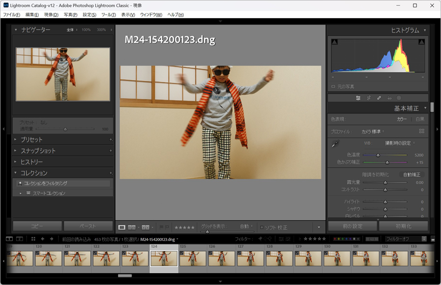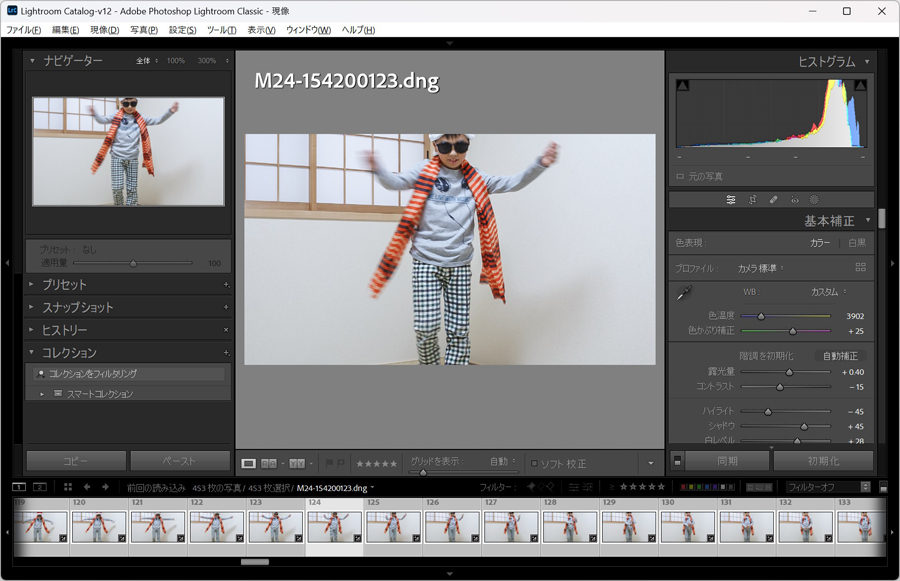 - 明るさや色などを調整し,編集:全てを選択,[同期]で全コマを現像する。